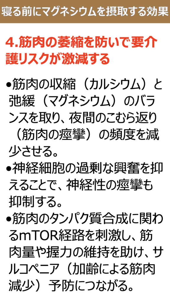筋肉の萎縮を防いで要介護リスクが激減する 筋肉の収縮(カルシウム)と弛緩(マグネシウム)のバランスを取り、夜間のこむら返り(筋肉の痙攣)の頻度を減少させる。