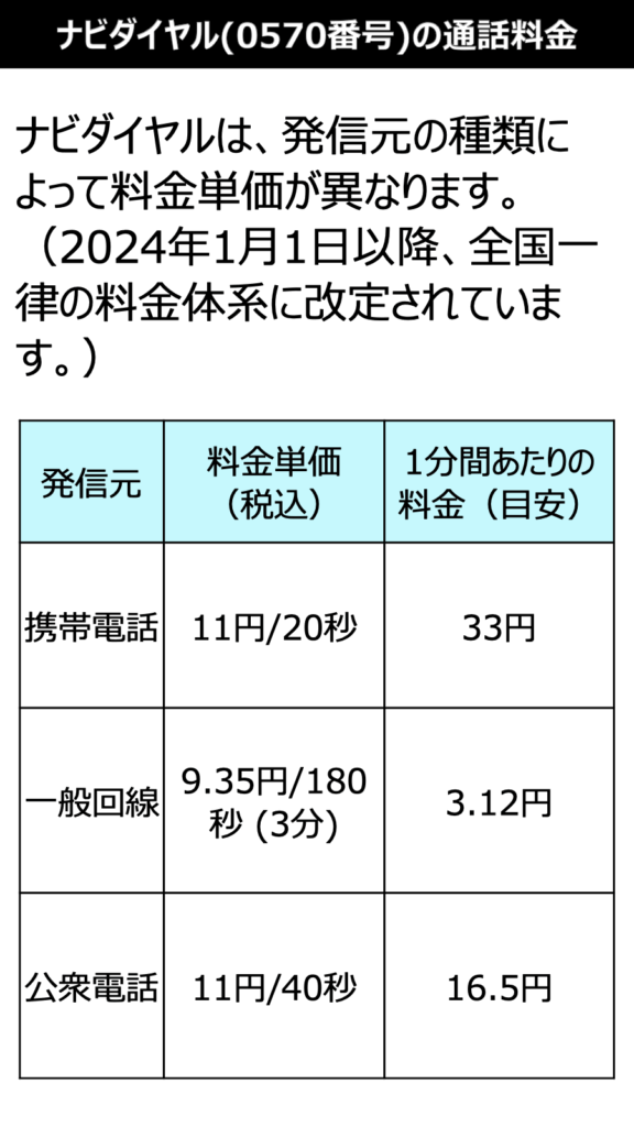ナビダイヤル(0570番号の通話料金は、通常の電話とは異なる仕組みで、発信者(電話をかけたがわが、全額負担します。