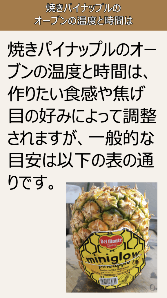 焼きパイナップルのオーブンの温度と時間は、作りたいしょっかんや焦げ目の好みによって調整されますが、一般的な目安は以下の表の通りです。