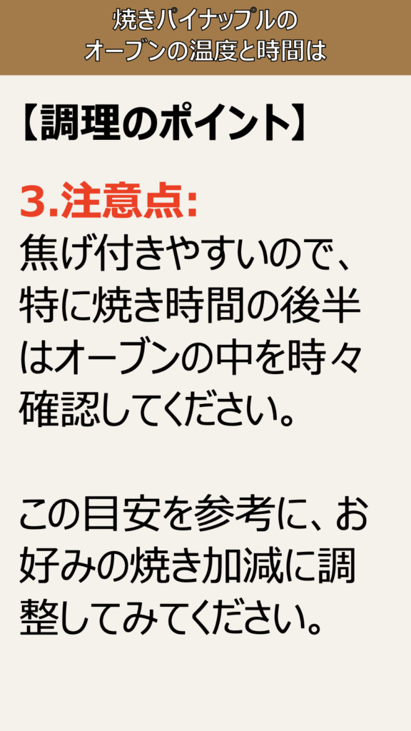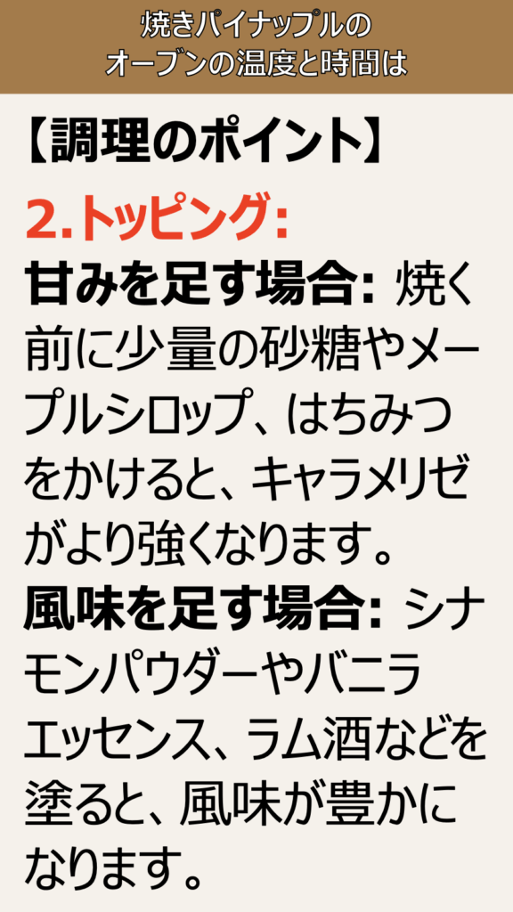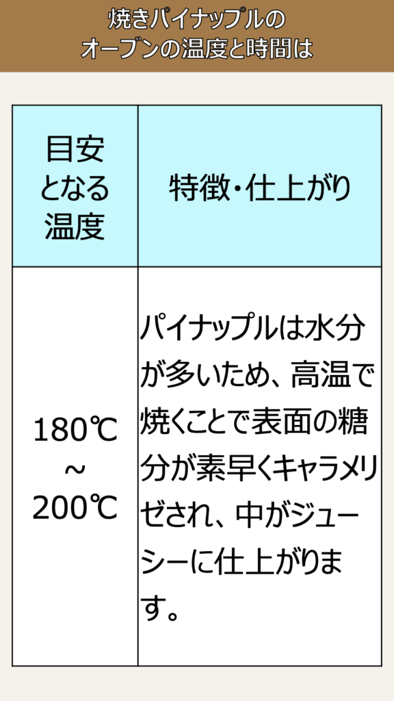 目安となる温度”、180どCから200どC 、パイナップルは水分が多いため、高温で焼くことで表面の糖分が素早くキャラメリゼされ、中がジューシーに仕上がります。