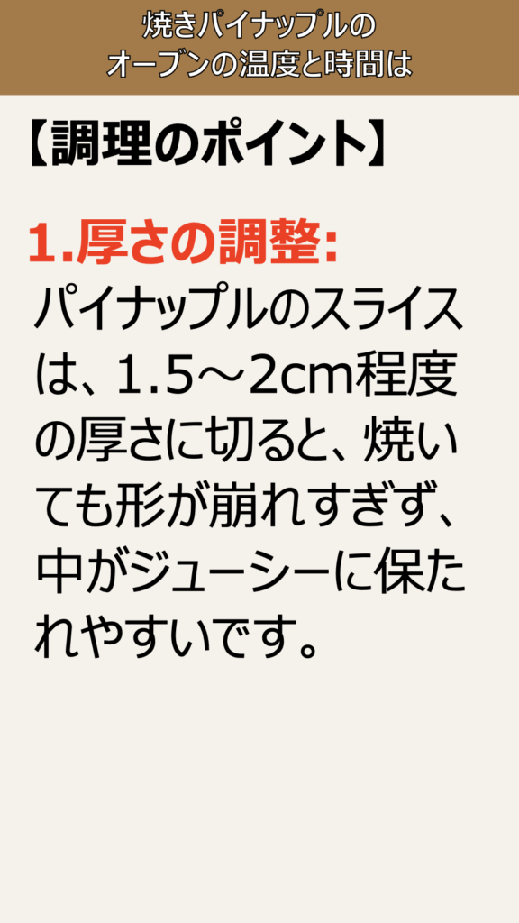 1.厚さの調整: パイナップルのスライスは、1.5から2cm程度の厚さに切ると、焼いても形が崩れすぎず、中がジューシーに保たれやすいです。