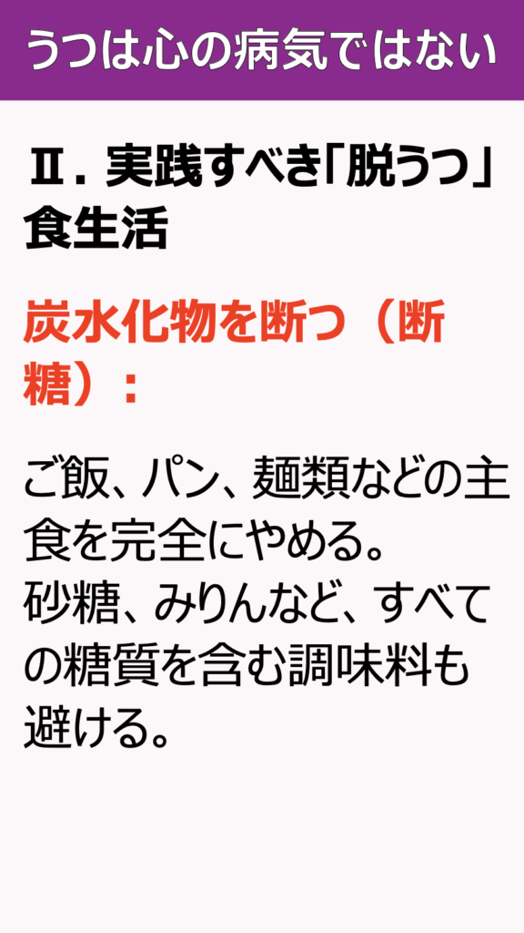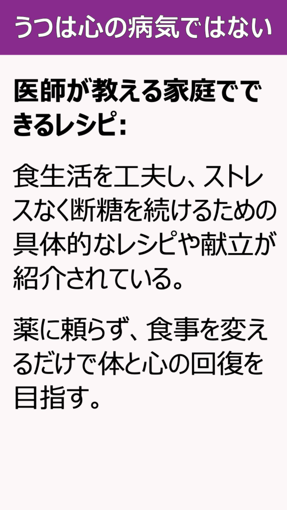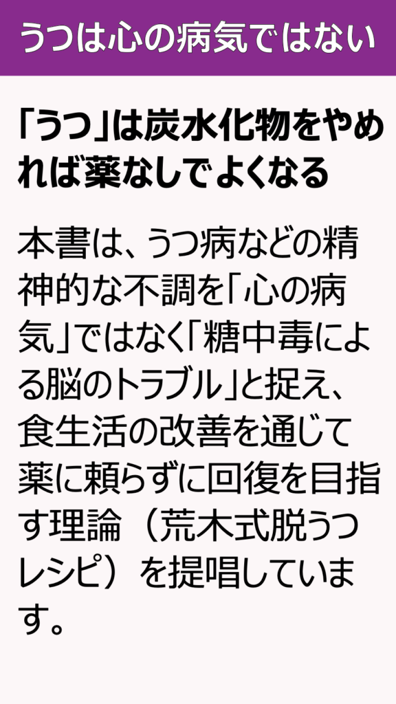 本書は、うつ病などの精神的な不調を「心の病気」ではなく「糖中毒による脳のトラブル」と捉え、食生活の改善を通じて薬に頼らずに回復を目指す理論(荒木式脱うつレシピ)を提唱しています。