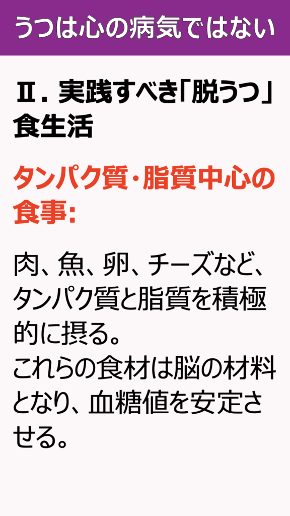 脳の機能を正常化させるためには、糖質ではなく、肉や魚に含まれる良質なタンパク質(アミノ酸)や必須脂肪酸が不可欠である。