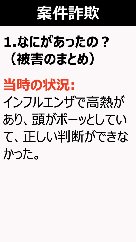 当時の状況:インフルエンザで高熱があり、頭がボーッとしていて、正しい判断ができなかった。