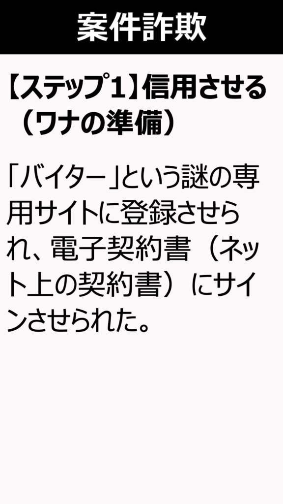「バイター」という謎の専用サイトに登録させられ、電子契約書(ネット上の契約書)にサインさせられた。