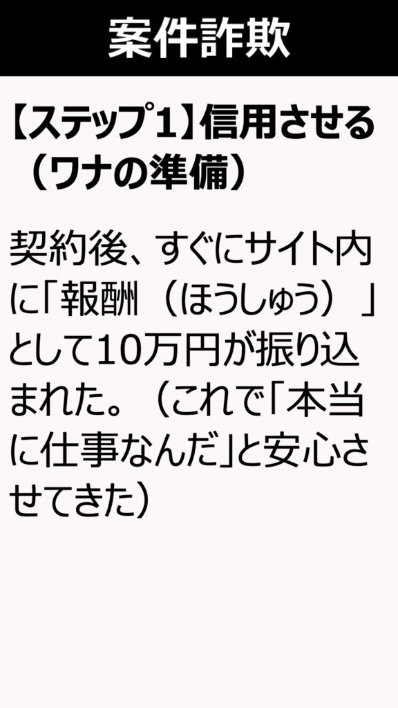契約後、すぐにサイト内に「報酬(ほうしゅう)」として10万円が振り込まれた。(これで「本当に仕事なんだ」と安心させてきた)