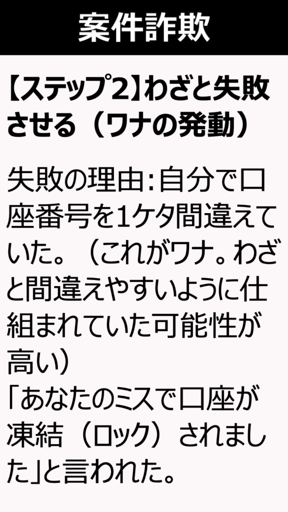 失敗の理由:自分で口座番号を1ケタ間違えていた。(※これがワナ。わざと間違えやすいように仕組まれていた可能性が高い)