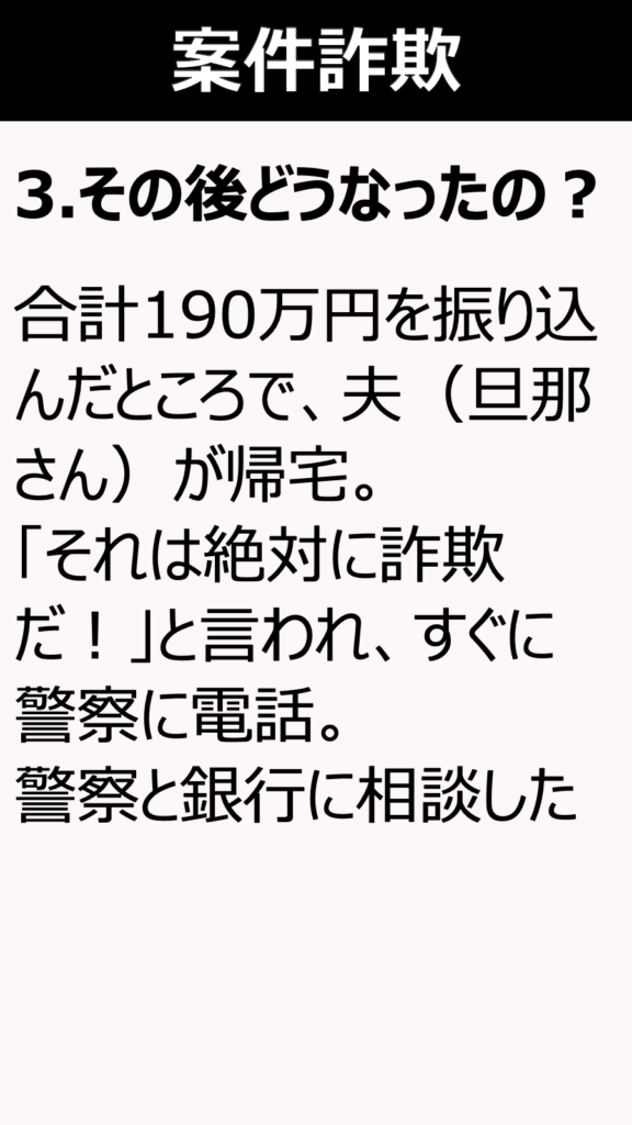 被害:「案件(あんけん)詐欺」という手口で、合計190万円をだまし取られました。