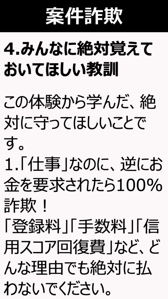 「登録料」「手数料」「信用スコア回復費」など、どんな理由でも絶対に払わないでください。