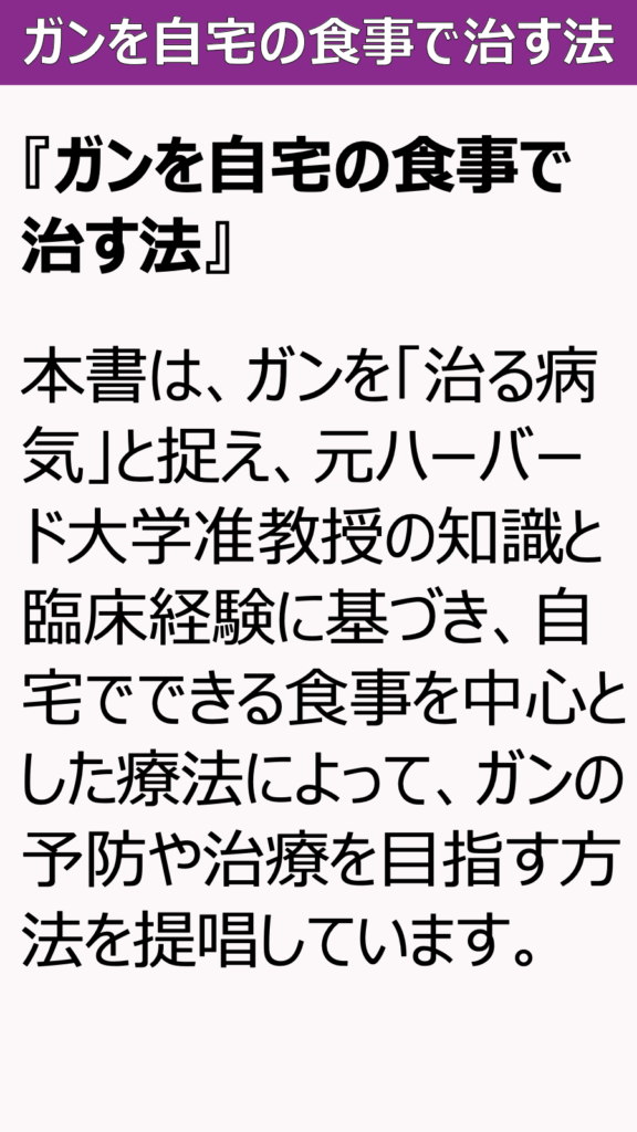 本書は、ガンを「治る病気」と捉え、元ハーバード大学准教授の知識と臨床経験に基づき、自宅でできる食事を中心とした療法によって、ガンの予防や治療を目指す方法を提唱しています。