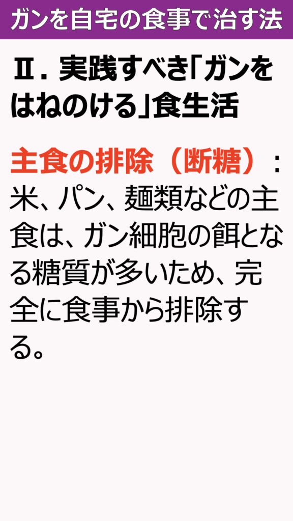米、パン、麺類などの主食は、ガン細胞の餌となる糖質が多いため、完全に食事から排除する。