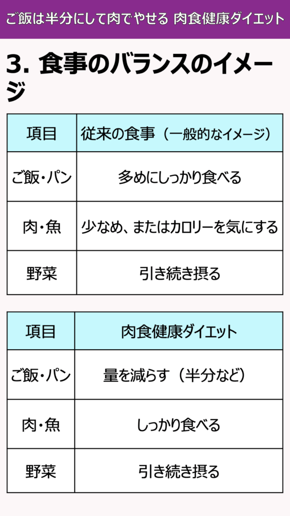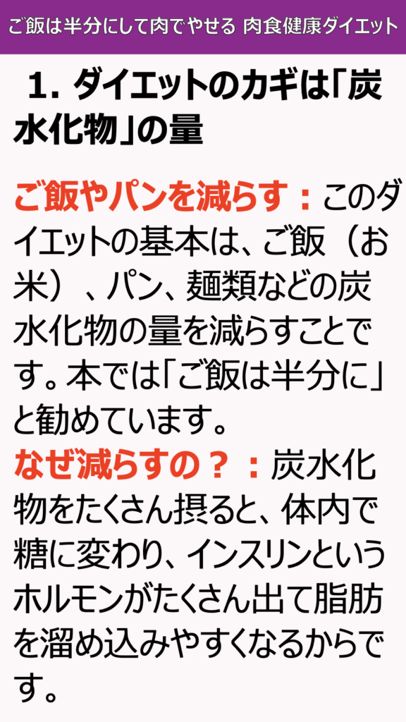 ご飯やパンを減らす:このダイエットの基本は、ご飯(お米)、パン、麺類などの炭水化物の量を減らすことです。本では「ご飯は半分に」と勧めています。