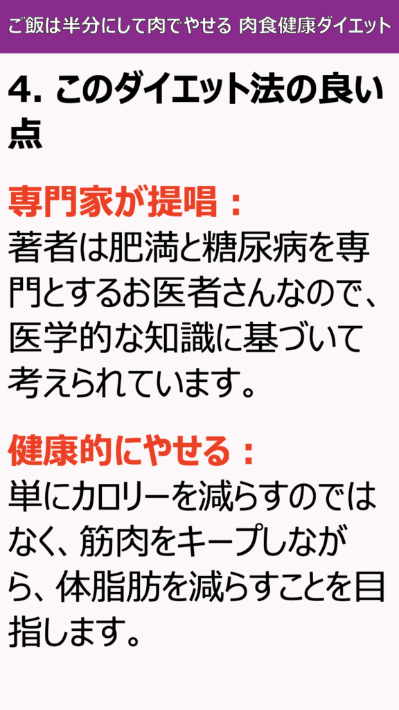 専門家が提唱:著者は肥満と糖尿病を専門とするお医者さんなので、医学的な知識に基づいて考えられています。