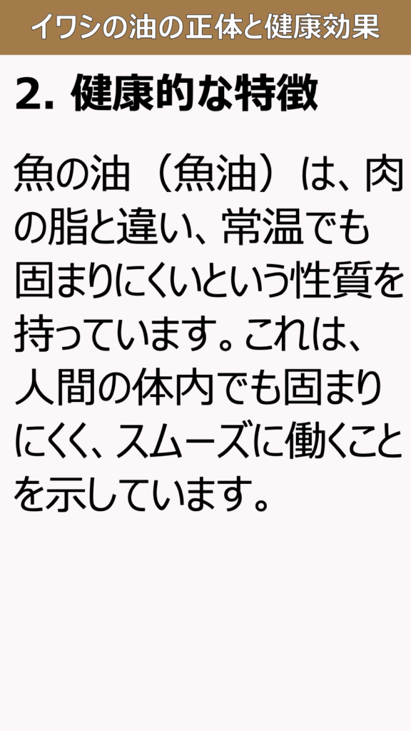 2. 健康的な特徴、魚の油(魚油は、肉の脂と違い、常温でも固まりにくいという性質を持っています。