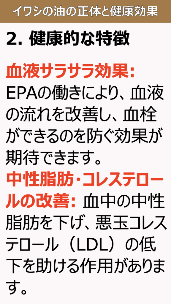 血液サラサラ効果: EPAの働きにより、血液の流れを改善し、血栓ができるのを防ぐ効果が期待できます。