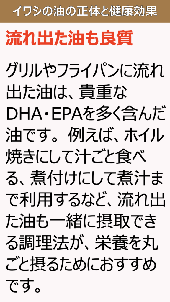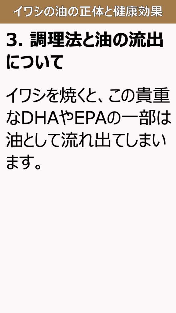 3. 調理法と油の流出について、イワシを焼くと、この貴重なDHAやEPAの一部は油として流れ出てしまいます。