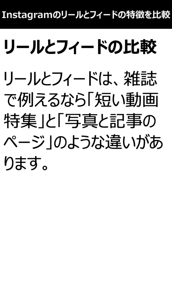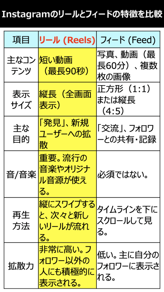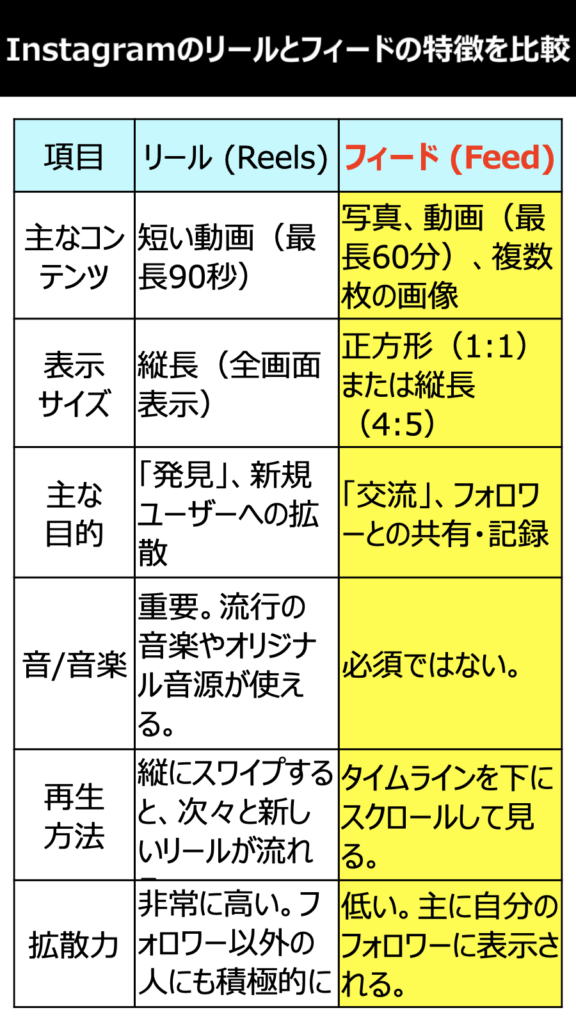 Instagramのリール(Reels)とフィード(Feed)は、どちらもコンテンツを投稿・閲覧するための機能ですが、それぞれ目的や特徴が大きく異なります。