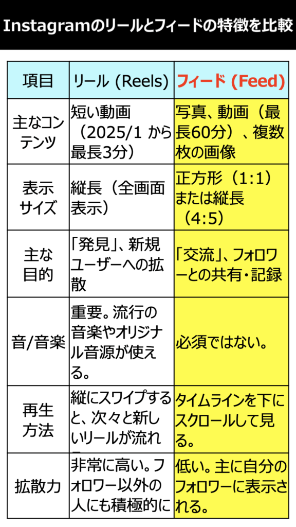 Instagramのリール(Reels)とフィード(Feed)は、どちらもコンテンツを投稿・閲覧するための機能ですが、それぞれ目的や特徴が大きく異なります。