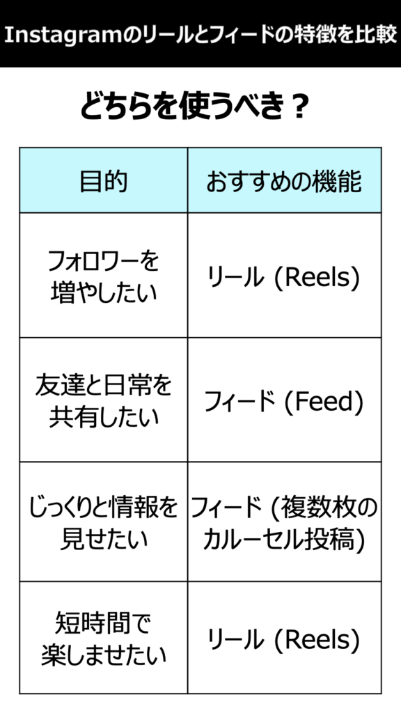 投稿の種類:写真、長めの動画、情報をまとめたカルーセル投稿(複数の画像)など、じっくり見せるコンテンツに適しています。