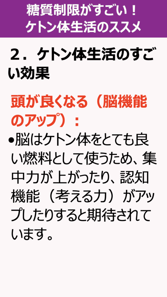 脳はケトン体をとても良い燃料として使うため、集中力が上がったり、認知機能(考える力)がアップしたりすると期待されています。