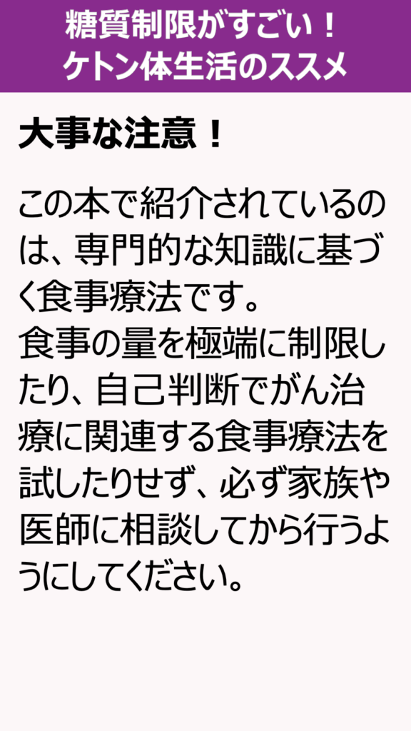 この本で紹介されているのは、専門的な知識に基づく食事療法です。特に成長期の中学生は、食事の量を極端に制限したり、自己判断でがん治療に関連する食事療法を試したりせず、必ず家族や医師に相談してから行うようにしてください。