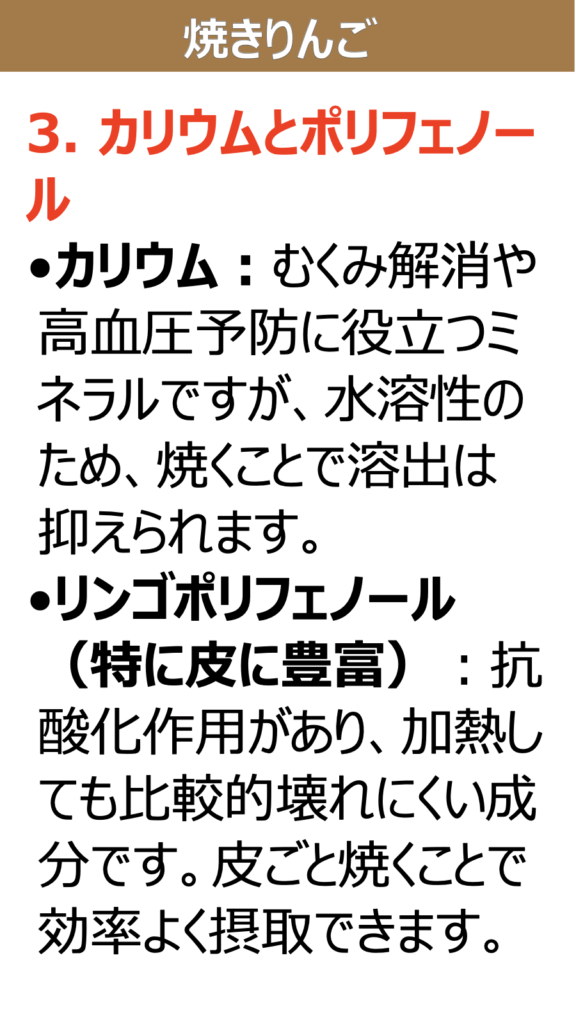 リンゴポリフェノール(特に皮に豊富):抗酸化作用があり、加熱しても比較的壊れにくい成分です。