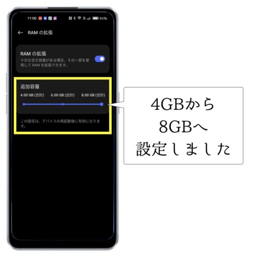 OPPO Reno9 AのRAMは8GBなのでもともと多いほうです