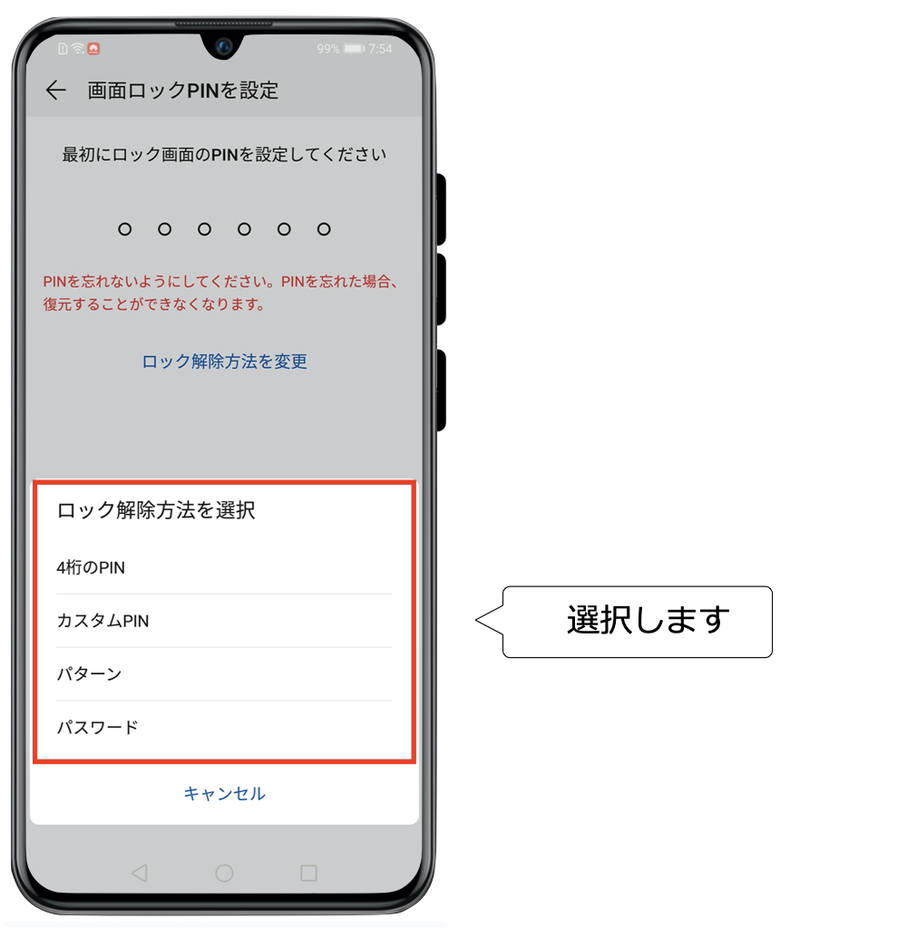 まず、PINコード入力とパターン入力の二つの方法の設定方法を説明します